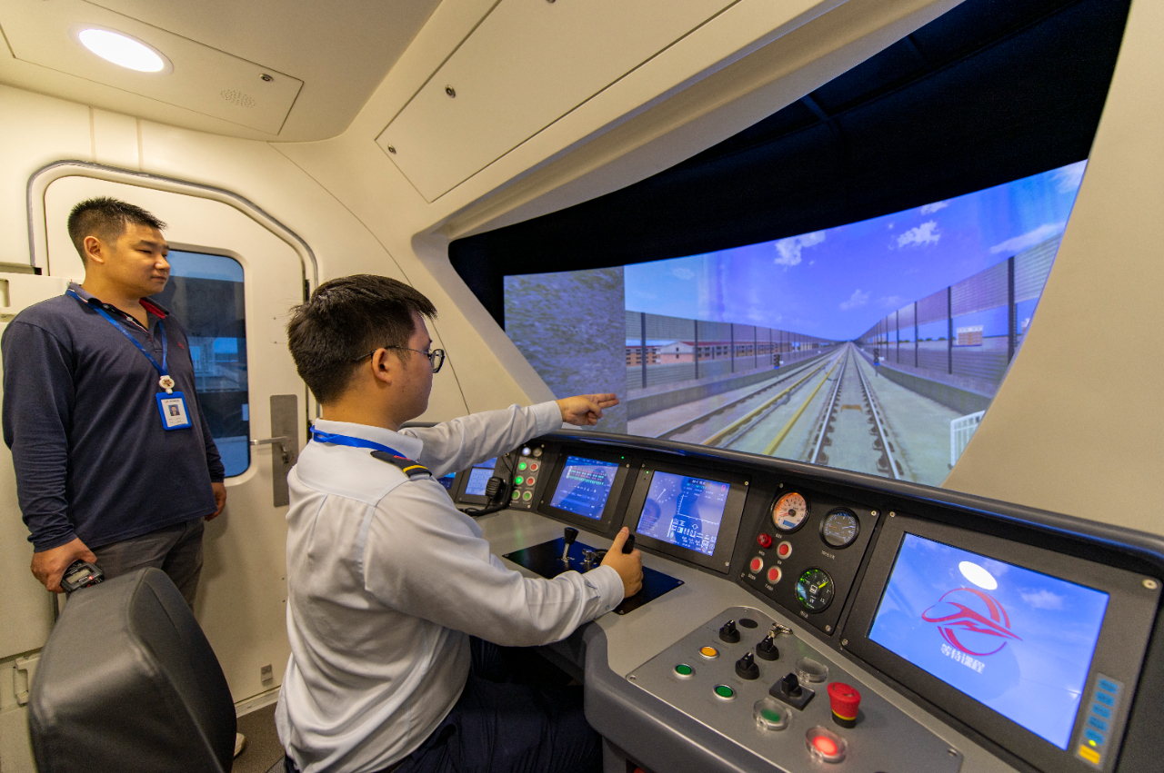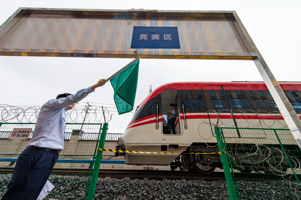 6月11日,在浙江省金華市金義東市域軌道交通工程塘雅車輛段,青年職工選手在參加軌道交通手動(dòng)駕駛項(xiàng)目技能比武。