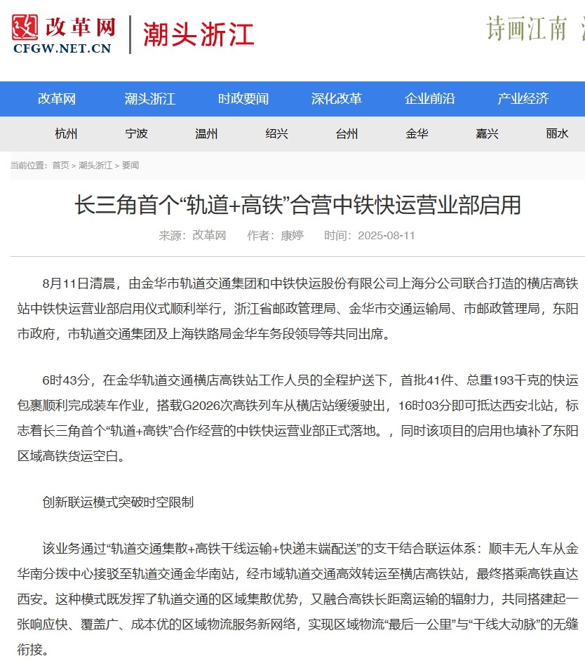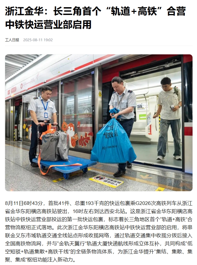 8月11日,長三角首個“軌道+高鐵”合營中鐵快運(yùn)營業(yè)部啟用。該營業(yè)部將串聯(lián)金義東市域軌道交通全線站點(diǎn)形成收攬網(wǎng)絡(luò),在全線31座車站均可辦理業(yè)務(wù),通過軌道交通集中收攬分撥后接入全國高鐵物流網(wǎng)。